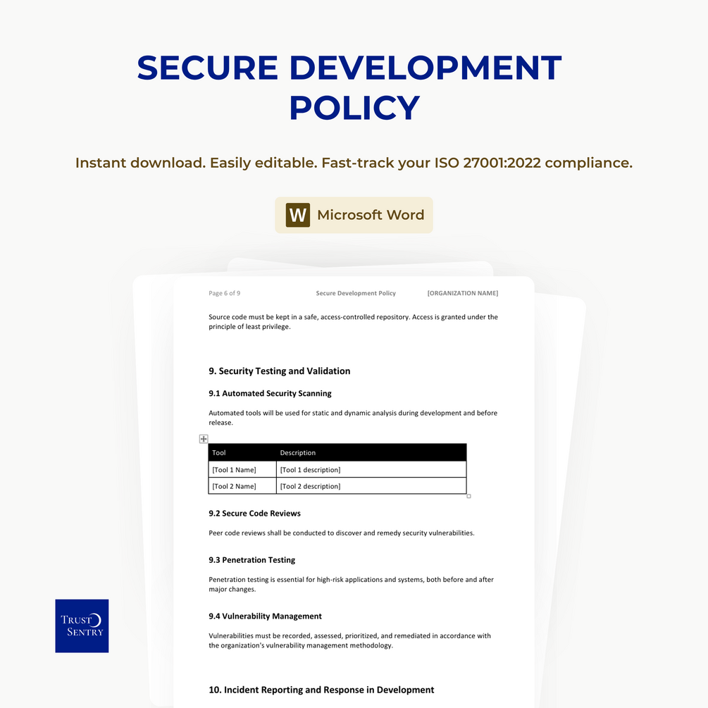 Secure software development is critical for ISO/IEC 27001:2022 compliance and organizational risk management. This policy defines clear requirements for secure coding, risk assessment, testing, and incident response within development processes.